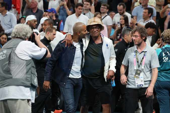Tony Parker et Yannick Noah - Les célébrités en tribunes pendant l'épreuve de basketball de Demi-Finale opposant la France à l'Allemagne lors des Jeux Olympiques de Paris 2024 (JO) à l'Arena Bercy, à Paris, France, le 8 août 2024. © Jacovides-Perusseau/Bestimage Celebrities in the stands during the Semi-Final basketball match between France and Germany during the Paris 2024 Olympic Games (Olympics) at the Arena Bercy in Paris, France, August 8, 2024.