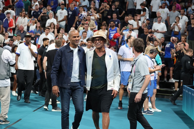 Tony Parker et Yannick Noah - Les célébrités en tribunes pendant l'épreuve de basketball de Demi-Finale opposant la France à l'Allemagne lors des Jeux Olympiques de Paris 2024 (JO) à l'Arena Bercy, à Paris, France, le 8 août 2024. © Jacovides-Perusseau/Bestimage Celebrities in the stands during the Semi-Final basketball match between France and Germany during the Paris 2024 Olympic Games (Olympics) at the Arena Bercy in Paris, France, August 8, 2024.