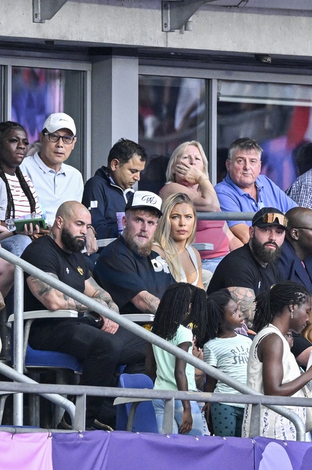 Jake Paul et sa compagne Jutta Leerdam - Les célébrités assistent aux épreuves d'athlétisme lors des Jeux Olympiques de Paris2024 (JO), le 8 août 2024. © Perusseau-Jacovides / Bestimage Celebrities attend the athletics events during the Paris 2024 Olympic Games (Olympics) on August 8, 2024.