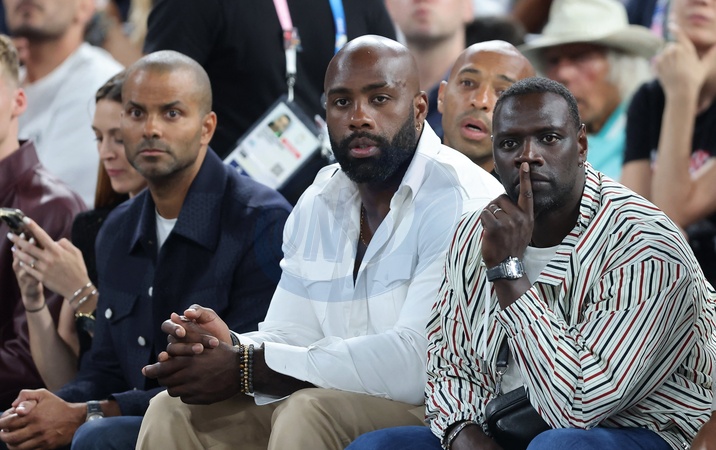 Tony Parker, Thierry Henry, Teddy Riner - Les célébrités en tribunes pendant la finale de basketball opposant les Etats-Unis à la France (98-87) lors des Jeux Olympiques de Paris 2024 (JO) à l'Arena Bercy, à Paris, France, le 10 août 2024. © Jacovides-Perusseau/Bestimage Celebrities in the stands during the Final basketball match between US and France during the Paris 2024 Olympic Games (Olympics) at the Arena Bercy in Paris, France, August 10, 2024.