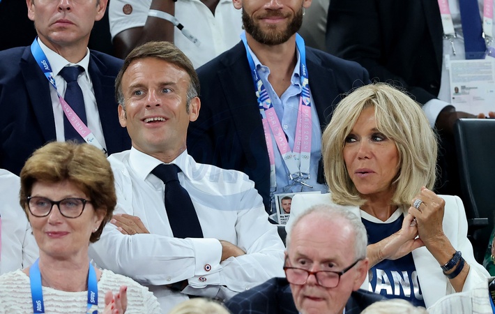 Emmanuel Macron, Brigitte Macron - Les célébrités en tribunes pendant la finale de basketball opposant les Etats-Unis à la France (98-87) lors des Jeux Olympiques de Paris 2024 (JO) à l'Arena Bercy, à Paris, France, le 10 août 2024. © Jacovides-Perusseau/Bestimage Celebrities in the stands during the Final basketball match between US and France during the Paris 2024 Olympic Games (Olympics) at the Arena Bercy in Paris, France, August 10, 2024.
