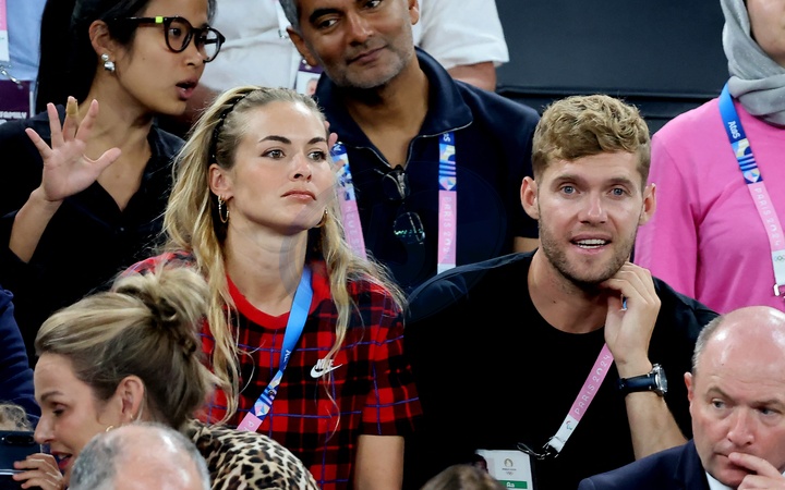 Kevin Mayer et sa compagne Delphine Jariel - Les célébrités en tribunes pendant la finale de basketball opposant les Etats-Unis à la France (98-87) lors des Jeux Olympiques de Paris 2024 (JO) à l'Arena Bercy, à Paris, France, le 10 août 2024. © Jacovides-Perusseau/Bestimage Celebrities in the stands during the Final basketball match between US and France during the Paris 2024 Olympic Games (Olympics) at the Arena Bercy in Paris, France, August 10, 2024.