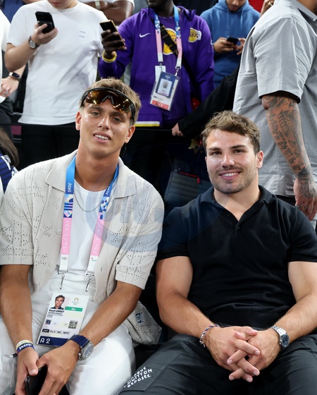 Kauli Vaast, Antoine Dupont - Les célébrités en tribunes pendant la finale de basketball opposant les Etats-Unis à la France (98-87) lors des Jeux Olympiques de Paris 2024 (JO) à l'Arena Bercy, à Paris, France, le 10 août 2024. © Jacovides-Perusseau/Bestimage Celebrities in the stands during the Final basketball match between US and France during the Paris 2024 Olympic Games (Olympics) at the Arena Bercy in Paris, France, August 10, 2024.