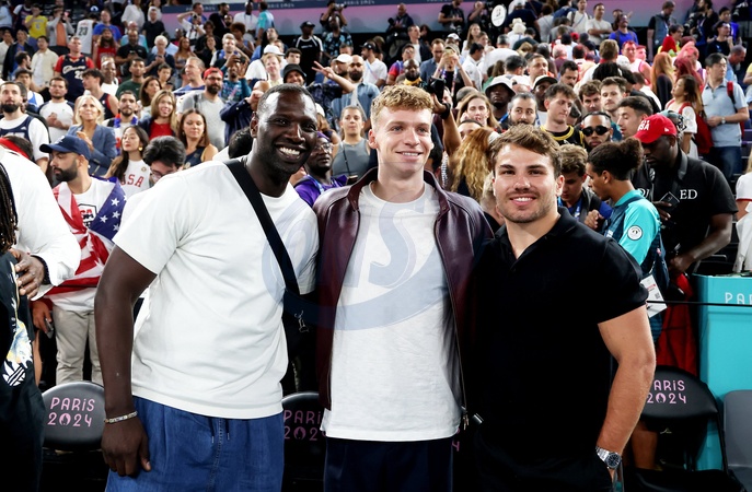 Omar Sy, Léon Marchand, Antoine Dupont - Les célébrités en tribunes pendant la finale de basketball opposant les Etats-Unis à la France (98-87) lors des Jeux Olympiques de Paris 2024 (JO) à l'Arena Bercy, à Paris, France, le 10 août 2024. © Jacovides-Perusseau/Bestimage Celebrities in the stands during the Final basketball match between US and France during the Paris 2024 Olympic Games (Olympics) at the Arena Bercy in Paris, France, August 10, 2024.