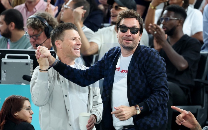 Jimmy Fallon - Les célébrités en tribunes pendant la finale de basketball opposant les Etats-Unis à la France (98-87) lors des Jeux Olympiques de Paris 2024 (JO) à l'Arena Bercy, à Paris, France, le 10 août 2024. © Jacovides-Perusseau/Bestimage Celebrities in the stands during the Final basketball match between US and France during the Paris 2024 Olympic Games (Olympics) at the Arena Bercy in Paris, France, August 10, 2024.