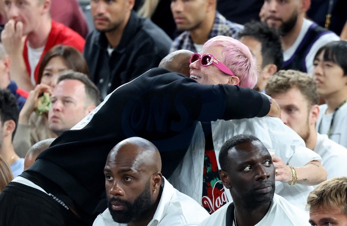 Thierry Henry et Megan Rapinoe - Les célébrités en tribunes pendant la finale de basketball opposant les Etats-Unis à la France (98-87) lors des Jeux Olympiques de Paris 2024 (JO) à l'Arena Bercy, à Paris, France, le 10 août 2024. © Jacovides-Perusseau/Bestimage Celebrities in the stands during the Final basketball match between US and France during the Paris 2024 Olympic Games (Olympics) at the Arena Bercy in Paris, France, August 10, 2024.