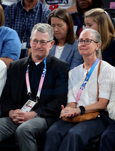 John Slusher - Les célébrités en tribunes pendant la finale de basketball opposant les Etats-Unis à la France (98-87) lors des Jeux Olympiques de Paris 2024 (JO) à l'Arena Bercy, à Paris, France, le 10 août 2024. © Jacovides-Perusseau/Bestimage Celebrities in the stands during the Final basketball match between US and France during the Paris 2024 Olympic Games (Olympics) at the Arena Bercy in Paris, France, August 10, 2024.
