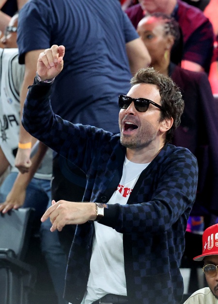Jimmy Fallon - Les célébrités en tribunes pendant la finale de basketball opposant les Etats-Unis à la France (98-87) lors des Jeux Olympiques de Paris 2024 (JO) à l'Arena Bercy, à Paris, France, le 10 août 2024. © Jacovides-Perusseau/Bestimage Celebrities in the stands during the Final basketball match between US and France during the Paris 2024 Olympic Games (Olympics) at the Arena Bercy in Paris, France, August 10, 2024.