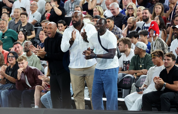 Léon Marchand, Thierry Henry, Teddy Riner, Omar Sy, Antoine Dupont - Les célébrités en tribunes pendant la finale de basketball opposant les Etats-Unis à la France (98-87) lors des Jeux Olympiques de Paris 2024 (JO) à l'Arena Bercy, à Paris, France, le 10 août 2024. © Jacovides-Perusseau/Bestimage Celebrities in the stands during the Final basketball match between US and France during the Paris 2024 Olympic Games (Olympics) at the Arena Bercy in Paris, France, August 10, 2024.
