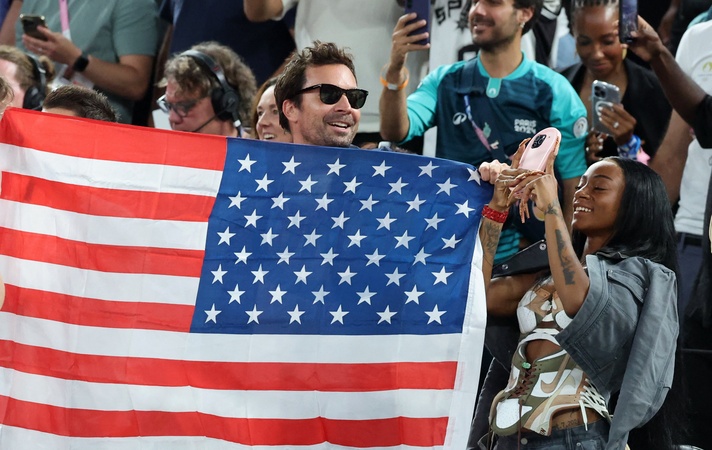 Jimmy Fallon, Sha'Carri Richardson - Les célébrités en tribunes pendant la finale de basketball opposant les Etats-Unis à la France (98-87) lors des Jeux Olympiques de Paris 2024 (JO) à l'Arena Bercy, à Paris, France, le 10 août 2024. © Jacovides-Perusseau/Bestimage Celebrities in the stands during the Final basketball match between US and France during the Paris 2024 Olympic Games (Olympics) at the Arena Bercy in Paris, France, August 10, 2024.