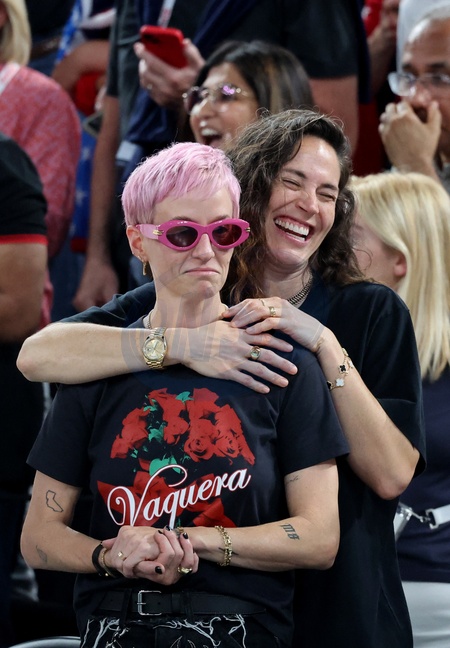 Megan Rapinoe et sa compagne - Les célébrités en tribunes pendant la finale de basketball opposant les Etats-Unis à la France (98-87) lors des Jeux Olympiques de Paris 2024 (JO) à l'Arena Bercy, à Paris, France, le 10 août 2024. © Jacovides-Perusseau/Bestimage Celebrities in the stands during the Final basketball match between US and France during the Paris 2024 Olympic Games (Olympics) at the Arena Bercy in Paris, France, August 10, 2024.