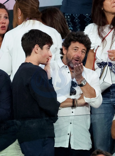 Patrick Bruel et son fils Léon - Les célébrités en tribunes pendant la finale de basketball opposant les Etats-Unis à la France (98-87) lors des Jeux Olympiques de Paris 2024 (JO) à l'Arena Bercy, à Paris, France, le 10 août 2024. © Jacovides-Perusseau/Bestimage Celebrities in the stands during the Final basketball match between US and France during the Paris 2024 Olympic Games (Olympics) at the Arena Bercy in Paris, France, August 10, 2024.