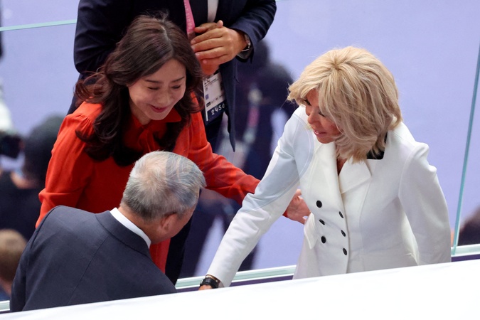 La première dame, Brigitte Macron - Cérémonie de clôture des Jeux Olympiques de Paris 2024 au stade de France à Saint-Denis, le 11 août 2024. 270 artistes, 8200 athlètes et accompagnants issus de 205 délégations se succèdent dans le stade, devant 72.0000 spectateurs, avec la cycliste française P.Ferrand-Prévot et le joueur de rugby français, A.Dupont comme porte-drapeau pour la France. Comme pour la cérémonie d'ouverture, la direction artistique de cet événement est signée, T.Jolly. Au programme de cette soirée, cérémonie des médailles, discours et extinction de la flamme olympique, le show artistique baptisé «Records», les groupes Air et Phoenix pour la partie musicale tandis que l'acteur américain T.Cruise participe à cet événement. K.Bass, maire de Los Angeles, reçoit le drapeau olympique des mains de la maire de Paris, A.Hidalgo, quatre ans avant les prochains Jeux Olympiques d'été dans la cité des anges. © Jacovides-Perusseau / Bestimage Closing ceremony of the Paris 2024 Olympic Games at the Stade de France in Saint-Denis, on August 11, 2024. 270 artists, 8,200 athletes and accompanying persons from 205 delegations took turn in the stadium, with French cyclist P. Ferrand-Prévot and French rugby player A. Dupont as flag bearers for France. As for the opening ceremony, the artistic direction of this event is signed by T. Jolly. On the program for this evening, medal ceremony, speeches and extinguishing of the Olympic flame, the artistic show called "Records", the groups Air and Phoenix for the musical part while the American actor T. Cruise participates in this event. K. Bass, mayor of Los Angeles, receives the Olympic flag from the hands of the mayor of Paris, A. Hidalgo, four years before the next Summer Olympic Games in the city of angels.