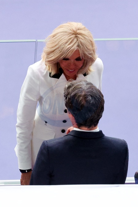 La première dame, Brigitte Macron et Gabriel Attal, Premier ministre - Cérémonie de clôture des Jeux Olympiques de Paris 2024 au stade de France à Saint-Denis, le 11 août 2024. 270 artistes, 8200 athlètes et accompagnants issus de 205 délégations se succèdent dans le stade, devant 72.0000 spectateurs, avec la cycliste française P.Ferrand-Prévot et le joueur de rugby français, A.Dupont comme porte-drapeau pour la France. Comme pour la cérémonie d'ouverture, la direction artistique de cet événement est signée, T.Jolly. Au programme de cette soirée, cérémonie des médailles, discours et extinction de la flamme olympique, le show artistique baptisé «Records», les groupes Air et Phoenix pour la partie musicale tandis que l'acteur américain T.Cruise participe à cet événement. K.Bass, maire de Los Angeles, reçoit le drapeau olympique des mains de la maire de Paris, A.Hidalgo, quatre ans avant les prochains Jeux Olympiques d'été dans la cité des anges. © Jacovides-Perusseau / Bestimage Closing ceremony of the Paris 2024 Olympic Games at the Stade de France in Saint-Denis, on August 11, 2024. 270 artists, 8,200 athletes and accompanying persons from 205 delegations took turn in the stadium, with French cyclist P. Ferrand-Prévot and French rugby player A. Dupont as flag bearers for France. As for the opening ceremony, the artistic direction of this event is signed by T. Jolly. On the program for this evening, medal ceremony, speeches and extinguishing of the Olympic flame, the artistic show called "Records", the groups Air and Phoenix for the musical part while the American actor T. Cruise participates in this event. K. Bass, mayor of Los Angeles, receives the Olympic flag from the hands of the mayor of Paris, A. Hidalgo, four years before the next Summer Olympic Games in the city of angels.