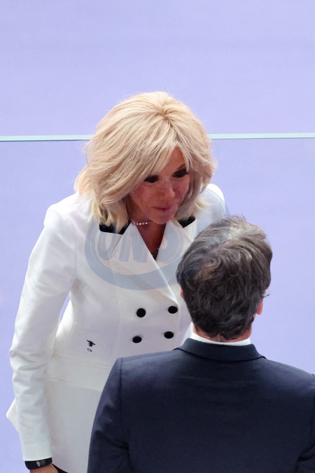 La première dame, Brigitte Macron et Gabriel Attal, Premier ministre - Cérémonie de clôture des Jeux Olympiques de Paris 2024 au stade de France à Saint-Denis, le 11 août 2024. 270 artistes, 8200 athlètes et accompagnants issus de 205 délégations se succèdent dans le stade, devant 72.0000 spectateurs, avec la cycliste française P.Ferrand-Prévot et le joueur de rugby français, A.Dupont comme porte-drapeau pour la France. Comme pour la cérémonie d'ouverture, la direction artistique de cet événement est signée, T.Jolly. Au programme de cette soirée, cérémonie des médailles, discours et extinction de la flamme olympique, le show artistique baptisé «Records», les groupes Air et Phoenix pour la partie musicale tandis que l'acteur américain T.Cruise participe à cet événement. K.Bass, maire de Los Angeles, reçoit le drapeau olympique des mains de la maire de Paris, A.Hidalgo, quatre ans avant les prochains Jeux Olympiques d'été dans la cité des anges. © Jacovides-Perusseau / Bestimage Closing ceremony of the Paris 2024 Olympic Games at the Stade de France in Saint-Denis, on August 11, 2024. 270 artists, 8,200 athletes and accompanying persons from 205 delegations took turn in the stadium, with French cyclist P. Ferrand-Prévot and French rugby player A. Dupont as flag bearers for France. As for the opening ceremony, the artistic direction of this event is signed by T. Jolly. On the program for this evening, medal ceremony, speeches and extinguishing of the Olympic flame, the artistic show called "Records", the groups Air and Phoenix for the musical part while the American actor T. Cruise participates in this event. K. Bass, mayor of Los Angeles, receives the Olympic flag from the hands of the mayor of Paris, A. Hidalgo, four years before the next Summer Olympic Games in the city of angels.