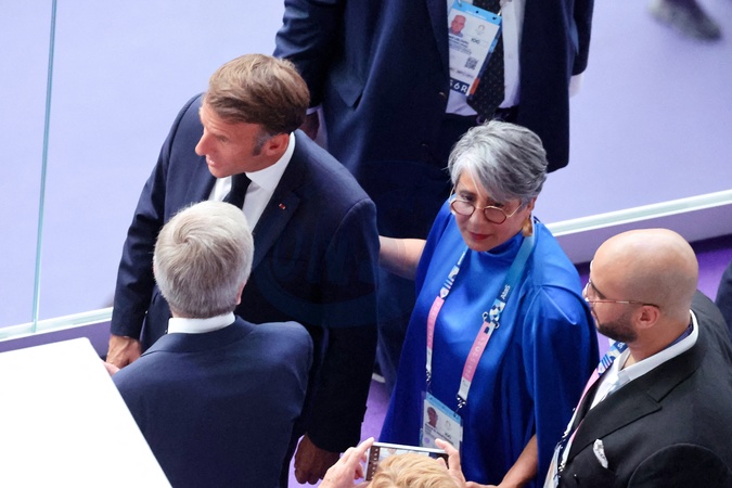 Le président de la République française Emmanuel Macron - Cérémonie de clôture des Jeux Olympiques de Paris 2024 au stade de France à Saint-Denis, le 11 août 2024. 270 artistes, 8200 athlètes et accompagnants issus de 205 délégations se succèdent dans le stade, devant 72.0000 spectateurs, avec la cycliste française P.Ferrand-Prévot et le joueur de rugby français, A.Dupont comme porte-drapeau pour la France. Comme pour la cérémonie d'ouverture, la direction artistique de cet événement est signée, T.Jolly. Au programme de cette soirée, cérémonie des médailles, discours et extinction de la flamme olympique, le show artistique baptisé «Records», les groupes Air et Phoenix pour la partie musicale tandis que l'acteur américain T.Cruise participe à cet événement. K.Bass, maire de Los Angeles, reçoit le drapeau olympique des mains de la maire de Paris, A.Hidalgo, quatre ans avant les prochains Jeux Olympiques d'été dans la cité des anges. © Jacovides-Perusseau / Bestimage Closing ceremony of the Paris 2024 Olympic Games at the Stade de France in Saint-Denis, on August 11, 2024. 270 artists, 8,200 athletes and accompanying persons from 205 delegations took turn in the stadium, with French cyclist P. Ferrand-Prévot and French rugby player A. Dupont as flag bearers for France. As for the opening ceremony, the artistic direction of this event is signed by T. Jolly. On the program for this evening, medal ceremony, speeches and extinguishing of the Olympic flame, the artistic show called "Records", the groups Air and Phoenix for the musical part while the American actor T. Cruise participates in this event. K. Bass, mayor of Los Angeles, receives the Olympic flag from the hands of the mayor of Paris, A. Hidalgo, four years before the next Summer Olympic Games in the city of angels.