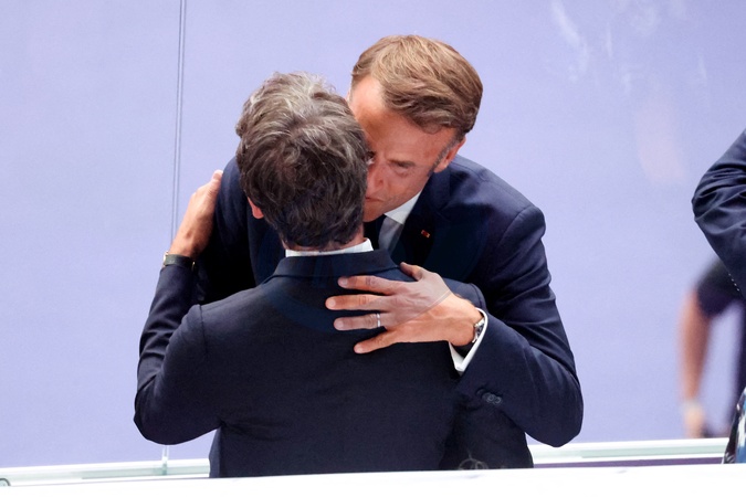 Le président de la République française Emmanuel Macron et Gabriel Attal, Premier ministre - Cérémonie de clôture des Jeux Olympiques de Paris 2024 au stade de France à Saint-Denis, le 11 août 2024. 270 artistes, 8200 athlètes et accompagnants issus de 205 délégations se succèdent dans le stade, devant 72.0000 spectateurs, avec la cycliste française P.Ferrand-Prévot et le joueur de rugby français, A.Dupont comme porte-drapeau pour la France. Comme pour la cérémonie d'ouverture, la direction artistique de cet événement est signée, T.Jolly. Au programme de cette soirée, cérémonie des médailles, discours et extinction de la flamme olympique, le show artistique baptisé «Records», les groupes Air et Phoenix pour la partie musicale tandis que l'acteur américain T.Cruise participe à cet événement. K.Bass, maire de Los Angeles, reçoit le drapeau olympique des mains de la maire de Paris, A.Hidalgo, quatre ans avant les prochains Jeux Olympiques d'été dans la cité des anges. © Jacovides-Perusseau / Bestimage Closing ceremony of the Paris 2024 Olympic Games at the Stade de France in Saint-Denis, on August 11, 2024. 270 artists, 8,200 athletes and accompanying persons from 205 delegations took turn in the stadium, with French cyclist P. Ferrand-Prévot and French rugby player A. Dupont as flag bearers for France. As for the opening ceremony, the artistic direction of this event is signed by T. Jolly. On the program for this evening, medal ceremony, speeches and extinguishing of the Olympic flame, the artistic show called "Records", the groups Air and Phoenix for the musical part while the American actor T. Cruise participates in this event. K. Bass, mayor of Los Angeles, receives the Olympic flag from the hands of the mayor of Paris, A. Hidalgo, four years before the next Summer Olympic Games in the city of angels.