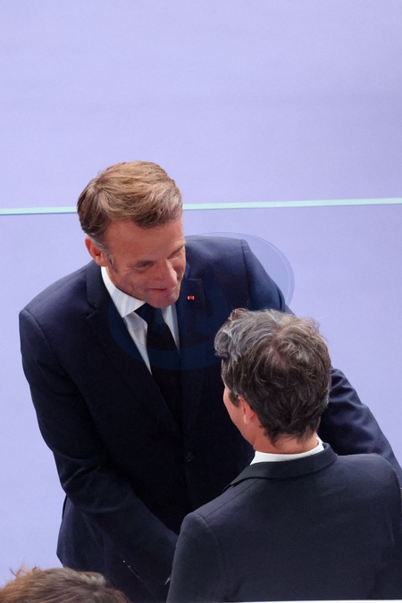 Le président de la République française Emmanuel Macron et Gabriel Attal, Premier ministre - Cérémonie de clôture des Jeux Olympiques de Paris 2024 au stade de France à Saint-Denis, le 11 août 2024. 270 artistes, 8200 athlètes et accompagnants issus de 205 délégations se succèdent dans le stade, devant 72.0000 spectateurs, avec la cycliste française P.Ferrand-Prévot et le joueur de rugby français, A.Dupont comme porte-drapeau pour la France. Comme pour la cérémonie d'ouverture, la direction artistique de cet événement est signée, T.Jolly. Au programme de cette soirée, cérémonie des médailles, discours et extinction de la flamme olympique, le show artistique baptisé «Records», les groupes Air et Phoenix pour la partie musicale tandis que l'acteur américain T.Cruise participe à cet événement. K.Bass, maire de Los Angeles, reçoit le drapeau olympique des mains de la maire de Paris, A.Hidalgo, quatre ans avant les prochains Jeux Olympiques d'été dans la cité des anges. © Jacovides-Perusseau / Bestimage Closing ceremony of the Paris 2024 Olympic Games at the Stade de France in Saint-Denis, on August 11, 2024. 270 artists, 8,200 athletes and accompanying persons from 205 delegations took turn in the stadium, with French cyclist P. Ferrand-Prévot and French rugby player A. Dupont as flag bearers for France. As for the opening ceremony, the artistic direction of this event is signed by T. Jolly. On the program for this evening, medal ceremony, speeches and extinguishing of the Olympic flame, the artistic show called "Records", the groups Air and Phoenix for the musical part while the American actor T. Cruise participates in this event. K. Bass, mayor of Los Angeles, receives the Olympic flag from the hands of the mayor of Paris, A. Hidalgo, four years before the next Summer Olympic Games in the city of angels.