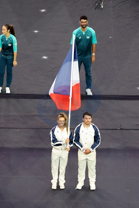 La cycliste Pauline Ferrand-Prévot et le rugbyman Antoine Dupont, porte-drapeau de la délégation française - Cérémonie de clôture des Jeux Olympiques de Paris 2024 au stade de France à Saint-Denis, le 11 août 2024. 270 artistes, 8200 athlètes et accompagnants issus de 205 délégations se succèdent dans le stade, devant 72.0000 spectateurs, avec la cycliste française P.Ferrand-Prévot et le joueur de rugby français, A.Dupont comme porte-drapeau pour la France. Comme pour la cérémonie d'ouverture, la direction artistique de cet événement est signée, T.Jolly. Au programme de cette soirée, cérémonie des médailles, discours et extinction de la flamme olympique, le show artistique baptisé «Records», les groupes Air et Phoenix pour la partie musicale tandis que l'acteur américain T.Cruise participe à cet événement. K.Bass, maire de Los Angeles, reçoit le drapeau olympique des mains de la maire de Paris, A.Hidalgo, quatre ans avant les prochains Jeux Olympiques d'été dans la cité des anges. © Jacovides-Perusseau / Bestimage Closing ceremony of the Paris 2024 Olympic Games at the Stade de France in Saint-Denis, on August 11, 2024. 270 artists, 8,200 athletes and accompanying persons from 205 delegations took turn in the stadium, with French cyclist P. Ferrand-Prévot and French rugby player A. Dupont as flag bearers for France. As for the opening ceremony, the artistic direction of this event is signed by T. Jolly. On the program for this evening, medal ceremony, speeches and extinguishing of the Olympic flame, the artistic show called "Records", the groups Air and Phoenix for the musical part while the American actor T. Cruise participates in this event. K. Bass, mayor of Los Angeles, receives the Olympic flag from the hands of the mayor of Paris, A. Hidalgo, four years before the next Summer Olympic Games in the city of angels.