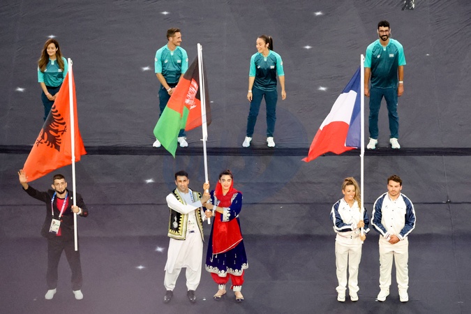 La cycliste Pauline Ferrand-Prévot et le rugbyman Antoine Dupont, porte-drapeau de la délégation française - Cérémonie de clôture des Jeux Olympiques de Paris 2024 au stade de France à Saint-Denis, le 11 août 2024. 270 artistes, 8200 athlètes et accompagnants issus de 205 délégations se succèdent dans le stade, devant 72.0000 spectateurs, avec la cycliste française P.Ferrand-Prévot et le joueur de rugby français, A.Dupont comme porte-drapeau pour la France. Comme pour la cérémonie d'ouverture, la direction artistique de cet événement est signée, T.Jolly. Au programme de cette soirée, cérémonie des médailles, discours et extinction de la flamme olympique, le show artistique baptisé «Records», les groupes Air et Phoenix pour la partie musicale tandis que l'acteur américain T.Cruise participe à cet événement. K.Bass, maire de Los Angeles, reçoit le drapeau olympique des mains de la maire de Paris, A.Hidalgo, quatre ans avant les prochains Jeux Olympiques d'été dans la cité des anges. © Jacovides-Perusseau / Bestimage Closing ceremony of the Paris 2024 Olympic Games at the Stade de France in Saint-Denis, on August 11, 2024. 270 artists, 8,200 athletes and accompanying persons from 205 delegations took turn in the stadium, with French cyclist P. Ferrand-Prévot and French rugby player A. Dupont as flag bearers for France. As for the opening ceremony, the artistic direction of this event is signed by T. Jolly. On the program for this evening, medal ceremony, speeches and extinguishing of the Olympic flame, the artistic show called "Records", the groups Air and Phoenix for the musical part while the American actor T. Cruise participates in this event. K. Bass, mayor of Los Angeles, receives the Olympic flag from the hands of the mayor of Paris, A. Hidalgo, four years before the next Summer Olympic Games in the city of angels.