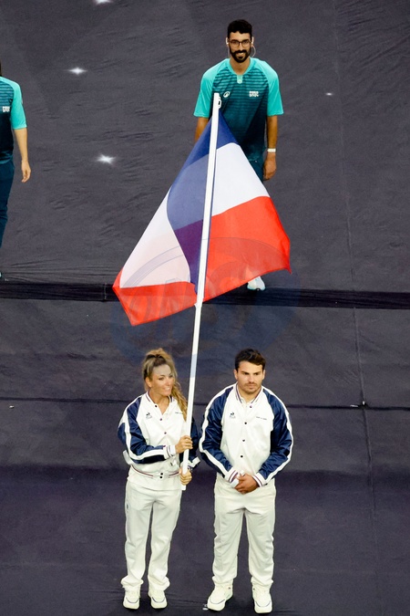La cycliste Pauline Ferrand-Prévot et le rugbyman Antoine Dupont, porte-drapeau de la délégation française - Cérémonie de clôture des Jeux Olympiques de Paris 2024 au stade de France à Saint-Denis, le 11 août 2024. 270 artistes, 8200 athlètes et accompagnants issus de 205 délégations se succèdent dans le stade, devant 72.0000 spectateurs, avec la cycliste française P.Ferrand-Prévot et le joueur de rugby français, A.Dupont comme porte-drapeau pour la France. Comme pour la cérémonie d'ouverture, la direction artistique de cet événement est signée, T.Jolly. Au programme de cette soirée, cérémonie des médailles, discours et extinction de la flamme olympique, le show artistique baptisé «Records», les groupes Air et Phoenix pour la partie musicale tandis que l'acteur américain T.Cruise participe à cet événement. K.Bass, maire de Los Angeles, reçoit le drapeau olympique des mains de la maire de Paris, A.Hidalgo, quatre ans avant les prochains Jeux Olympiques d'été dans la cité des anges. © Jacovides-Perusseau / Bestimage Closing ceremony of the Paris 2024 Olympic Games at the Stade de France in Saint-Denis, on August 11, 2024. 270 artists, 8,200 athletes and accompanying persons from 205 delegations took turn in the stadium, with French cyclist P. Ferrand-Prévot and French rugby player A. Dupont as flag bearers for France. As for the opening ceremony, the artistic direction of this event is signed by T. Jolly. On the program for this evening, medal ceremony, speeches and extinguishing of the Olympic flame, the artistic show called "Records", the groups Air and Phoenix for the musical part while the American actor T. Cruise participates in this event. K. Bass, mayor of Los Angeles, receives the Olympic flag from the hands of the mayor of Paris, A. Hidalgo, four years before the next Summer Olympic Games in the city of angels.
