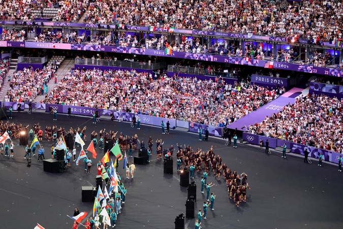 Défilé des 205 délégations - Cérémonie de clôture des Jeux Olympiques de Paris 2024 au stade de France à Saint-Denis, le 11 août 2024. 270 artistes, 8200 athlètes et accompagnants issus de 205 délégations se succèdent dans le stade, devant 72.0000 spectateurs, avec la cycliste française P.Ferrand-Prévot et le joueur de rugby français, A.Dupont comme porte-drapeau pour la France. Comme pour la cérémonie d'ouverture, la direction artistique de cet événement est signée, T.Jolly. Au programme de cette soirée, cérémonie des médailles, discours et extinction de la flamme olympique, le show artistique baptisé «Records», les groupes Air et Phoenix pour la partie musicale tandis que l'acteur américain T.Cruise participe à cet événement. K.Bass, maire de Los Angeles, reçoit le drapeau olympique des mains de la maire de Paris, A.Hidalgo, quatre ans avant les prochains Jeux Olympiques d'été dans la cité des anges. © Jacovides-Perusseau / Bestimage Closing ceremony of the Paris 2024 Olympic Games at the Stade de France in Saint-Denis, on August 11, 2024. 270 artists, 8,200 athletes and accompanying persons from 205 delegations took turn in the stadium, with French cyclist P. Ferrand-Prévot and French rugby player A. Dupont as flag bearers for France. As for the opening ceremony, the artistic direction of this event is signed by T. Jolly. On the program for this evening, medal ceremony, speeches and extinguishing of the Olympic flame, the artistic show called "Records", the groups Air and Phoenix for the musical part while the American actor T. Cruise participates in this event. K. Bass, mayor of Los Angeles, receives the Olympic flag from the hands of the mayor of Paris, A. Hidalgo, four years before the next Summer Olympic Games in the city of angels.