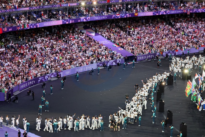 Défilé des 205 délégations - Cérémonie de clôture des Jeux Olympiques de Paris 2024 au stade de France à Saint-Denis, le 11 août 2024. 270 artistes, 8200 athlètes et accompagnants issus de 205 délégations se succèdent dans le stade, devant 72.0000 spectateurs, avec la cycliste française P.Ferrand-Prévot et le joueur de rugby français, A.Dupont comme porte-drapeau pour la France. Comme pour la cérémonie d'ouverture, la direction artistique de cet événement est signée, T.Jolly. Au programme de cette soirée, cérémonie des médailles, discours et extinction de la flamme olympique, le show artistique baptisé «Records», les groupes Air et Phoenix pour la partie musicale tandis que l'acteur américain T.Cruise participe à cet événement. K.Bass, maire de Los Angeles, reçoit le drapeau olympique des mains de la maire de Paris, A.Hidalgo, quatre ans avant les prochains Jeux Olympiques d'été dans la cité des anges. © Jacovides-Perusseau / Bestimage Closing ceremony of the Paris 2024 Olympic Games at the Stade de France in Saint-Denis, on August 11, 2024. 270 artists, 8,200 athletes and accompanying persons from 205 delegations took turn in the stadium, with French cyclist P. Ferrand-Prévot and French rugby player A. Dupont as flag bearers for France. As for the opening ceremony, the artistic direction of this event is signed by T. Jolly. On the program for this evening, medal ceremony, speeches and extinguishing of the Olympic flame, the artistic show called "Records", the groups Air and Phoenix for the musical part while the American actor T. Cruise participates in this event. K. Bass, mayor of Los Angeles, receives the Olympic flag from the hands of the mayor of Paris, A. Hidalgo, four years before the next Summer Olympic Games in the city of angels.