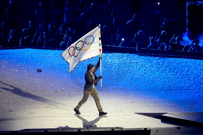 Tom Cruise, accroché à un fil, descend du toit du stade de France pour prendre le drapeau olympique