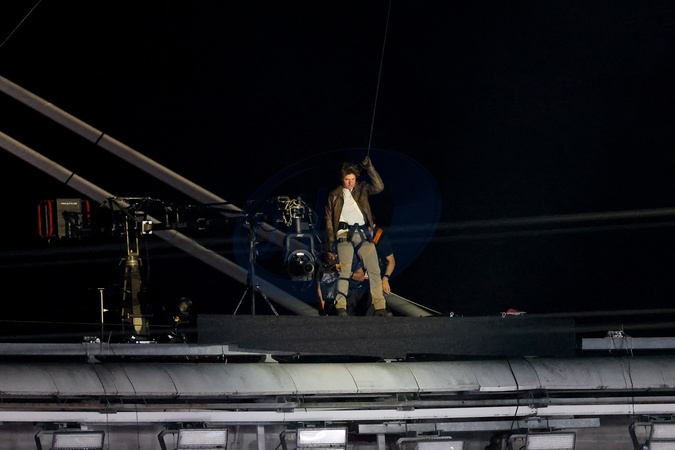 Tom Cruise wiszący na włosku schodzi z dachu Stade de France, aby odebrać flagę olimpijską