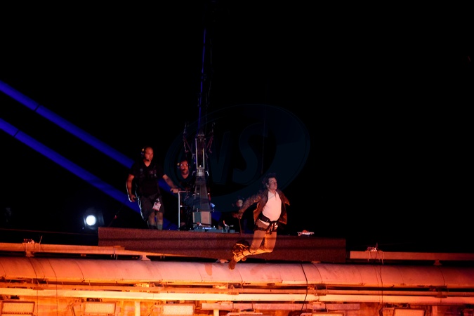 Tom Cruise, accroché à un fil, descend du toit du stade de France pour prendre le drapeau olympique