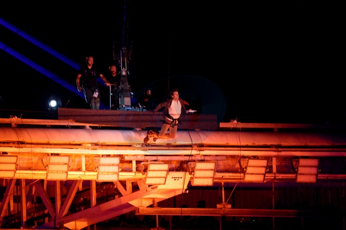 Tom Cruise wiszący na włosku schodzi z dachu Stade de France, aby odebrać flagę olimpijską
