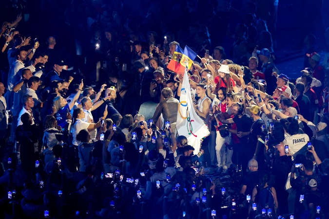 Tom Cruise, accroché à un fil, descend du toit du stade de France pour prendre le drapeau olympique
