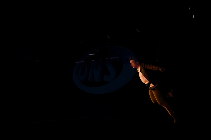 Tom Cruise wiszący na włosku schodzi z dachu Stade de France, aby odebrać flagę olimpijską