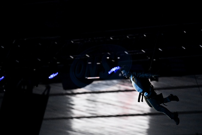 Tom Cruise, accroché à un fil, descend du toit du stade de France pour prendre le drapeau olympique des mains de l'athlète américaine, S.Biles, sous le regard de K.Bass, maire de Los Angeles, où se dérouleront les prochains jeux olympiques d'été en 2028 - Cérémonie de clôture des Jeux Olympiques de Paris 2024 au stade de France à Saint-Denis, le 11 août 2024. 270 artistes, 8200 athlètes et accompagnants issus de 205 délégations se succèdent dans le stade, devant 72.0000 spectateurs, avec la cycliste française P.Ferrand-Prévot et le joueur de rugby français, A.Dupont comme porte-drapeau pour la France. Comme pour la cérémonie d'ouverture, la direction artistique de cet événement est signée, T.Jolly. Au programme de cette soirée, cérémonie des médailles, discours et extinction de la flamme olympique, le show artistique baptisé «Records», les groupes Air et Phoenix pour la partie musicale tandis que l'acteur américain T.Cruise participe à cet événement. K.Bass, maire de Los Angeles, reçoit le drapeau olympique des mains de la maire de Paris, A.Hidalgo, quatre ans avant les prochains Jeux Olympiques d'été dans la cité des anges. © Jacovides-Perusseau / Bestimage Closing ceremony of the Paris 2024 Olympic Games at the Stade de France in Saint-Denis, on August 11, 2024. 270 artists, 8,200 athletes and accompanying persons from 205 delegations took turn in the stadium, with French cyclist P. Ferrand-Prévot and French rugby player A. Dupont as flag bearers for France. As for the opening ceremony, the artistic direction of this event is signed by T. Jolly. On the program for this evening, medal ceremony, speeches and extinguishing of the Olympic flame, the artistic show called "Records", the groups Air and Phoenix for the musical part while the American actor T. Cruise participates in this event. K. Bass, mayor of Los Angeles, receives the Olympic flag from the hands of the mayor of Paris, A. Hidalgo, four years before the next Summer Olympic Games in the city of angels.