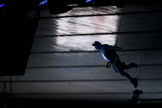 Tom Cruise, accroché à un fil, descend du toit du stade de France pour prendre le drapeau olympique