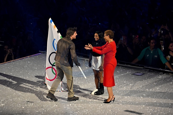 Tom Cruise, accroché à un fil, descend du toit du stade de France pour prendre le drapeau olympique des mains de l'athlète américaine, S.Biles, sous le regard de K.Bass, maire de Los Angeles, où se dérouleront les prochains jeux olympiques d'été en 2028 - Cérémonie de clôture des Jeux Olympiques de Paris 2024 au stade de France à Saint-Denis, le 11 août 2024. 270 artistes, 8200 athlètes et accompagnants issus de 205 délégations se succèdent dans le stade, devant 72.0000 spectateurs, avec la cycliste française P.Ferrand-Prévot et le joueur de rugby français, A.Dupont comme porte-drapeau pour la France. Comme pour la cérémonie d'ouverture, la direction artistique de cet événement est signée, T.Jolly. Au programme de cette soirée, cérémonie des médailles, discours et extinction de la flamme olympique, le show artistique baptisé «Records», les groupes Air et Phoenix pour la partie musicale tandis que l'acteur américain T.Cruise participe à cet événement. K.Bass, maire de Los Angeles, reçoit le drapeau olympique des mains de la maire de Paris, A.Hidalgo, quatre ans avant les prochains Jeux Olympiques d'été dans la cité des anges. © Jacovides-Perusseau / Bestimage Closing ceremony of the Paris 2024 Olympic Games at the Stade de France in Saint-Denis, on August 11, 2024. 270 artists, 8,200 athletes and accompanying persons from 205 delegations took turn in the stadium, with French cyclist P. Ferrand-Prévot and French rugby player A. Dupont as flag bearers for France. As for the opening ceremony, the artistic direction of this event is signed by T. Jolly. On the program for this evening, medal ceremony, speeches and extinguishing of the Olympic flame, the artistic show called "Records", the groups Air and Phoenix for the musical part while the American actor T. Cruise participates in this event. K. Bass, mayor of Los Angeles, receives the Olympic flag from the hands of the mayor of Paris, A. Hidalgo, four years before the next Summer Olympic Games in the city of angels.