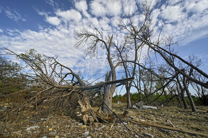 MYRNOHRAD, UKRAINE - AUGUST 7, 2024 - Trees broken by the shock wave are near the Myrnohrad Infectious Diseases Hospital destroyed by a Russian FAB-500 bomb on July 27, 2024, Myrnohrad, Donetsk Region, eastern Ukraine., Credit:Dmytro Smolienko / Avalon