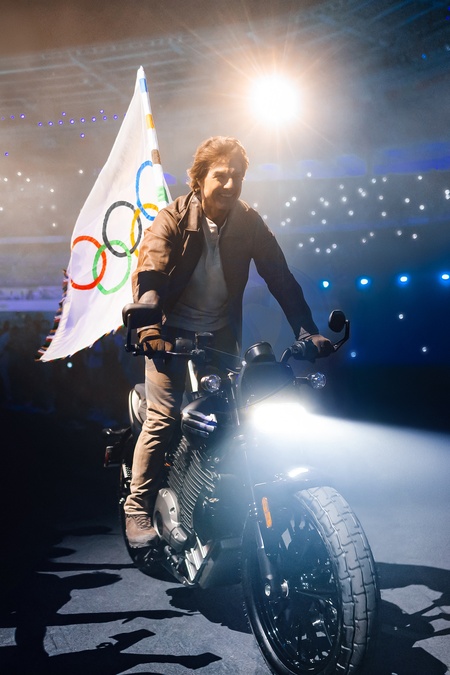 Tom Cruise podczas przekazania flagi olimpijskiej pomiędzy Paryżem a Los Angeles podczas ceremonii zamknięcia Igrzysk Olimpijskich w Paryżu (OG) 2024 na Stade de France
