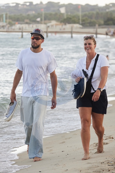 Exclusif - Devin Booker et Kevin Durant les stars de la Team USA de basket-ball championne olympique se baladent sur une plage de St Tropez avec des amies