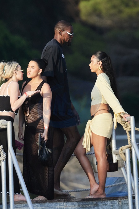 Exclusif - Devin Booker et Kevin Durant les stars de la Team USA de basket-ball championne olympique se baladent sur une plage de Saint-Tropez avec des amies le 14 août 2024. Exclusive - Devin Booker and Kevin Durant, the stars of the Olympic champion USA basketball team, stroll on a beach in St Tropez with friends on 14/08/2024