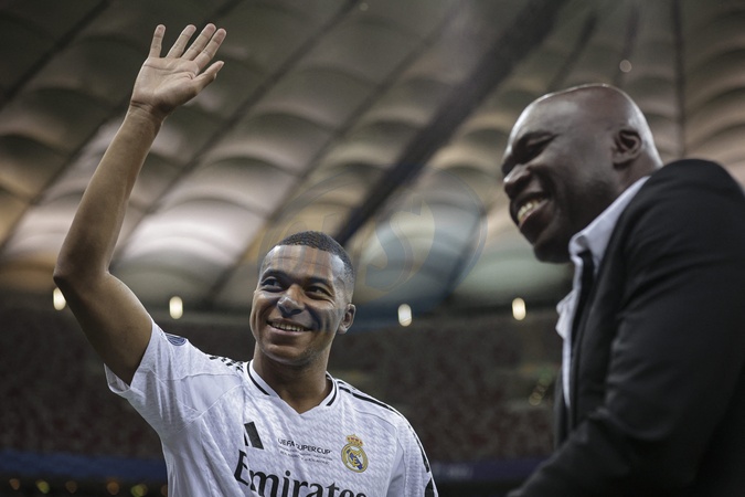 9 KYLIAN MBAPPE (RM) and wilfried mbappe Real Madrid celebrate victory after the UEFA Super Cup 2024 - Match de football "Real Madrid vs Atlanta" lors de la Supercoupe de l'UEFA. Le 14 août 2024 © Elyxandro CEGARRA / Panoramic / Bestimage