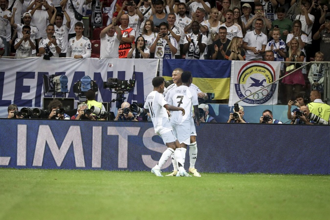 Joie des joueurs de Real Madrid apres le but de 9 KYLIAN MBAPPE (RM) - Match de football "Real Madrid vs Atlanta" lors de la Supercoupe de l'UEFA. Le 14 août 2024 © Elyxandro CEGARRA / Panoramic / Bestimage