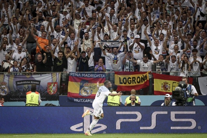 Joie des joueurs de Real Madrid apres le but de 9 KYLIAN MBAPPE (RM) - Match de football "Real Madrid vs Atlanta" lors de la Supercoupe de l'UEFA. Le 14 août 2024 © Elyxandro CEGARRA / Panoramic / Bestimage