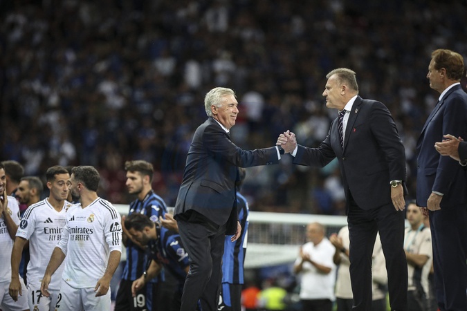 CARLO ANCELOTTI, COACH REAM MADRID Real Madrid celebrate victory after the UEFA Super Cup 2024 - Match de football "Real Madrid vs Atlanta" lors de la Supercoupe de l'UEFA. Le 14 août 2024 © Elyxandro CEGARRA / Panoramic / Bestimage