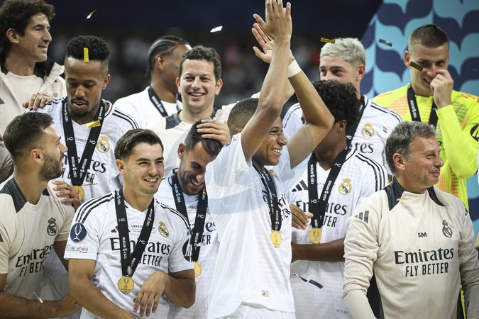 9 KYLIAN MBAPPE (RM) Real Madrid celebrate victory after the UEFA Super Cup 2024 - Match de football "Real Madrid vs Atlanta" lors de la Supercoupe de l'UEFA. Le 14 août 2024 © Elyxandro CEGARRA / Panoramic / Bestimage