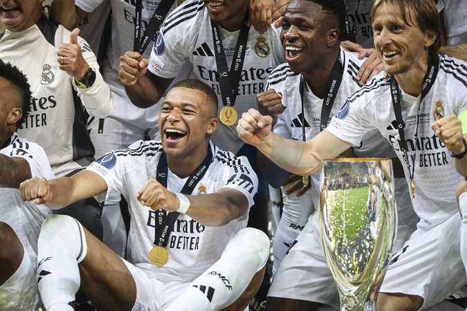 9 KYLIAN MBAPPE (RM) Real Madrid celebrate victory after the UEFA Super Cup 2024 - Match de football "Real Madrid vs Atlanta" lors de la Supercoupe de l'UEFA. Le 14 août 2024 © Elyxandro CEGARRA / Panoramic / Bestimage