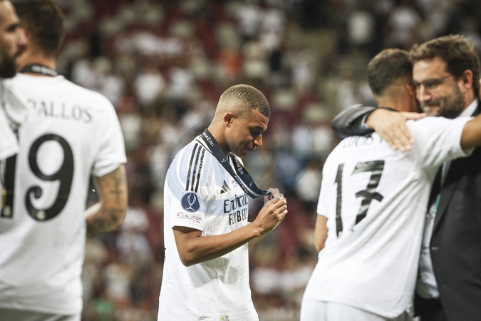 9 KYLIAN MBAPPE (RM) Real Madrid celebrate victory after the UEFA Super Cup 2024 - Match de football "Real Madrid vs Atlanta" lors de la Supercoupe de l'UEFA. Le 14 août 2024 © Elyxandro CEGARRA / Panoramic / Bestimage
