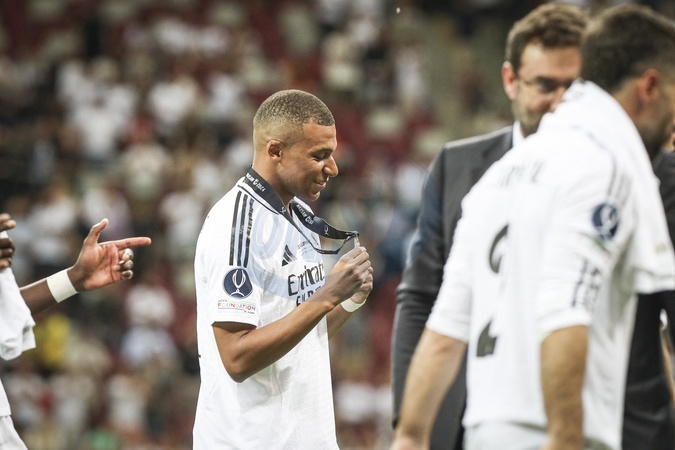 9 KYLIAN MBAPPE (RM) Real Madrid celebrate victory after the UEFA Super Cup 2024 - Match de football "Real Madrid vs Atlanta" lors de la Supercoupe de l'UEFA. Le 14 août 2024 © Elyxandro CEGARRA / Panoramic / Bestimage