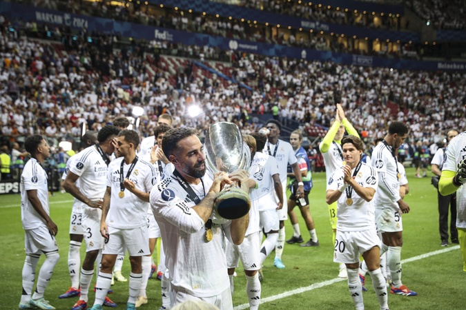 2 DANI CARVAJAL (RM) Real Madrid celebrate victory after the UEFA Super Cup 2024 - Match de football "Real Madrid vs Atlanta" lors de la Supercoupe de l'UEFA. Le 14 août 2024 © Elyxandro CEGARRA / Panoramic / Bestimage
