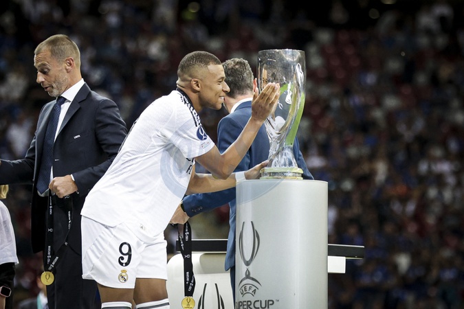 9 KYLIAN MBAPPE (RM) Real Madrid celebrate victory after the UEFA Super Cup 2024 - Match de football "Real Madrid vs Atlanta" lors de la Supercoupe de l'UEFA. Le 14 août 2024 © Elyxandro CEGARRA / Panoramic / Bestimage